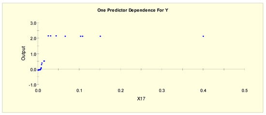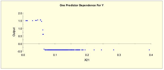 From Table 2, the most important predictor contributing to predicting the response is TSH (X17), with a score of 100. The second most important predictor is FTI (X21), with a score of 63.88. We can observe that all six quantitative variables contribute to predicting the response, as each quantitative variable has a score higher than zero. The dependency plots of all the quantitative variables are shown in Figure 1, Figure 2, Figure 3, Figure 4, Figure 5 and Figure 6: the vertical axis represents a 0.5[log(p1/p0)], where p1 is the probability that the variable is in class 1 and where p0 is the probability that the variable is in class 0. For simplicity, we refer to 0.5[log(p1/p0)] as the logit or log-odds. The interpretation from TreeNet is based on comparing the relative values of the log-odds; i.e., the higher the value of the log odds, the higher the probability that a variable is in class 1.