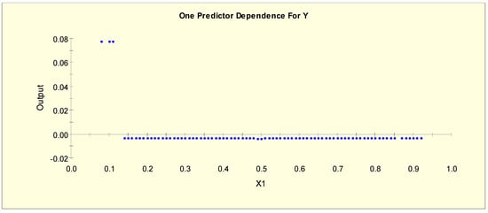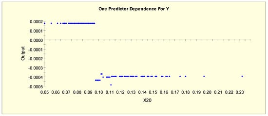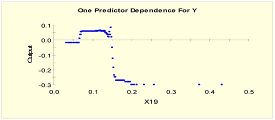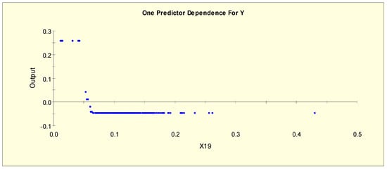 A TreeNet model can consist of hundreds or thousands of trees. However, the summary of TreeNet is shown directly via two plots—the variable importance plot and the partial dependency plot—both of which greatly facilitate the procedure we propose. The variable importance plot provides the score that each variable contributes to predicting the response. This is the relative importance score, which rescales the raw variable importance score so that the most important variable always receives a score of 100 []. The raw variable importance score is computed as the cumulative sum of the improvements of all the splits associated with a given variable across all trees up to a specific model size. This plot is useful for analysis because it shows which variables have scores above zero, i.e., the variables we need to focus on in the model.