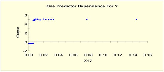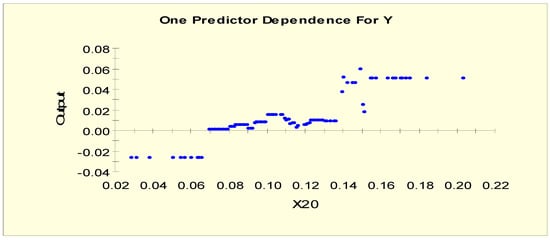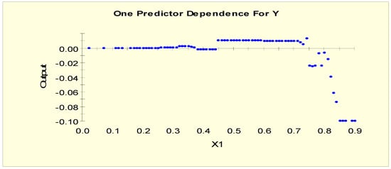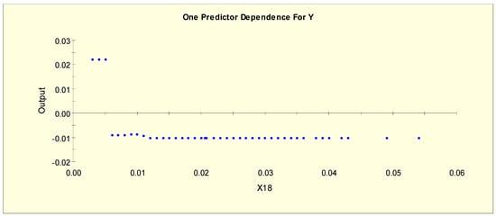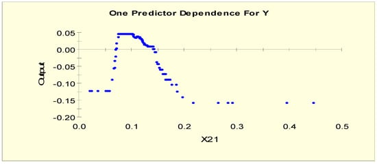 From Figure 7, Figure 8, Figure 9, Figure 10, Figure 11 and Figure 12, we take each quantitative variable and assign their parts to categories according to the respective function of each to the logit. Next, the new variables are generated as binary variables (Table 6). Please note that TreeNet by Salford Systems includes a feature that shows which values of the predictors constitute the separating points.
