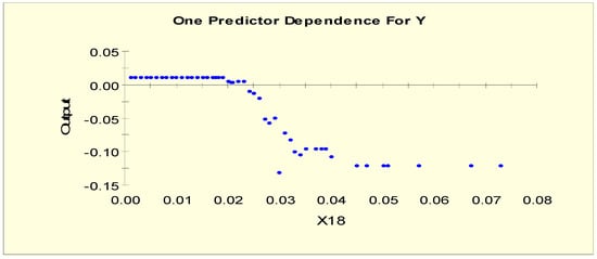 Figure 9 shows the partial dependency plot, which indicates the relationship between T3 (X18) and the log-odds from Model 2. From this plot, we can separate X18 into three levels given that it shows a downward slope when X18 = 0.02. The downward slope stops when X18 = 0.045, and there is no change in the log-odds after this value. Therefore, this predictor is separated into three levels with two splitting values, 0.02 and 0.045. The three binary variables, X18LL1, X18LL2, and X18LL3, are generated as shown in Table 6.