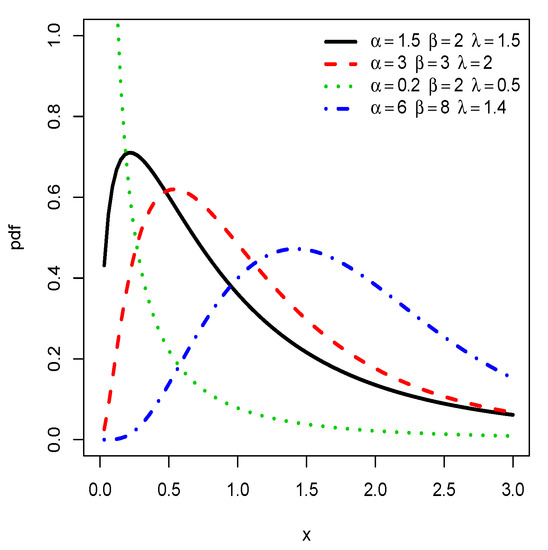 For a given , the critical points for can be determined numerically by using a mathematical software. Also, the fine shape analysis for requires its first and second order derivatives with respect to x. The complexity of these functions is an obstacle to determine the exact range of values of the parameters characterizing the different shapes. A graphic approach is thus preferred. Thats is, in order to illustrate its flexibility, Figure 3 displays some plots of for some different values of the parameters.