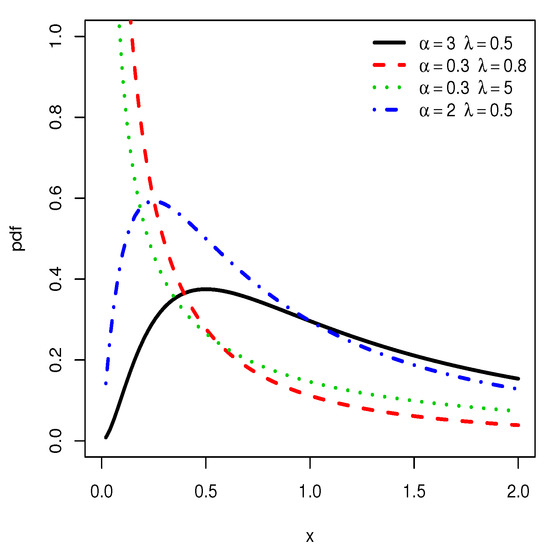 where is a positive scale parameter and is a positive shape parameter, and for . The reasons for the interest of the IL distribution are the following ones. It has proved itself as a statistical model in various applications, including economics and actuarial sciences (see [3]) and geophysics (see [4]). Also, the mathematical and inferential aspects of the IL distribution are well developed. See, for instance, Reference [5] for the Lorenz ordering of order statistics, Reference [6] for the parameters estimation in a Bayesian setting, Reference [7] for the parameters estimation from hybrid censored samples, Reference [8] for the study of the reliability estimator under type II censoring and Reference [9] for the Bayesian estimation of two-component mixture of the IL distribution under type I censoring. Despite an interesting compromise between simplicity and accuracy, the IL model suffers from a certain rigidity in the peak (punctual and roundness) and tail properties. This motivates the developments of diverse parametric extensions, such as the inverse power Lomax distribution introduced by [10], the Weibull IL distribution studied by [11] and the Marshall-Olkin IL distribution studied by [12].