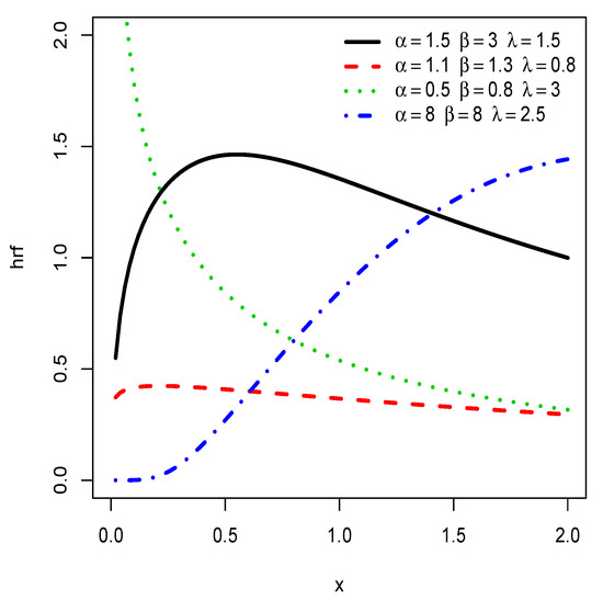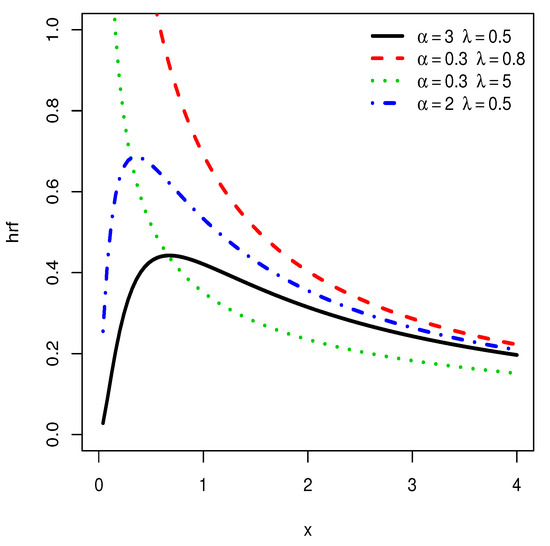 and for . The analytical study of this hrf is important to understand the modeling capacity of the HLIL model. First, the following equivalences are true. As , we have and, as , we have . We deduce the following asymptotic properties, which are similar to those for . For , we have , for , we have and for , we have . Furthermore, we always have . As an alpha remark, based on the obtained asymptote as , for close to 1, constant shapes for the can be observed for small values of x.