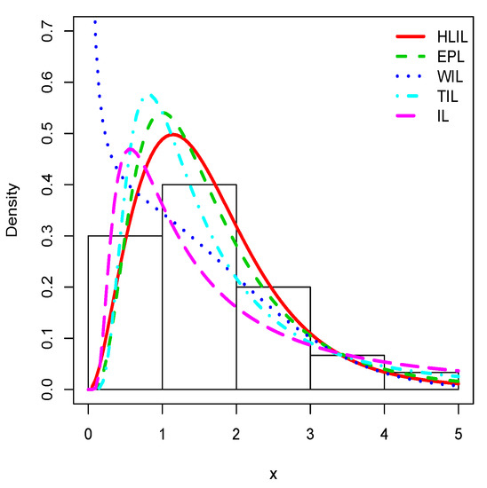 where is a positive shape parameter and denotes a cdf of a continuous univariate distribution. Here, represents a vector of parameter(s) related to the corresponding parental distribution. The main motivations behind the half logistic generated family are as follows. First, it is proved in [13] that the combined effect of the considered ratio and power transformations can significantly enrich the parental distribution, improving the flexibility of the mode, median, skewness and tail, with a positive impact on the analyses of practical data sets. The normal, Weibull and Fréchet distributions have been considered as parents in [13]. Recent studies have also pointed out these facts in other practical settings. See, for instance, References [14,15,16] which consider the generalized Weibull, Topp-Leone and power Lomax distributions as parental distributions, respectively. However, the half logistic generated family remains underexploited and, based on the previous promising studies, needs more thorough attention. In this paper, we contribute in this direction of work, with the consideration of the IL distribution as a parent.
