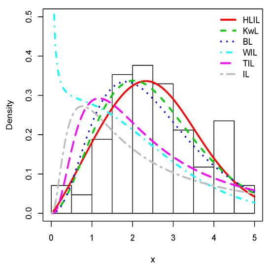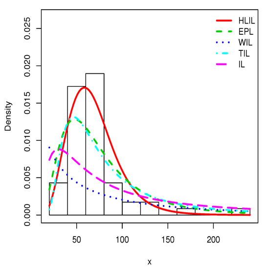 Visually, it is clear that the fit of the HLIL distribution is more adequate. The high flexibility of the peak and tails of the pdf of the HLIL distribution is clearly the key to success in terms of adaptability, far beyond the modeling ability of the former IL distribution. Moreover, for the third data set, as illustrated by Figure 7, the adaptive power of the HLIL is particularly dominant.