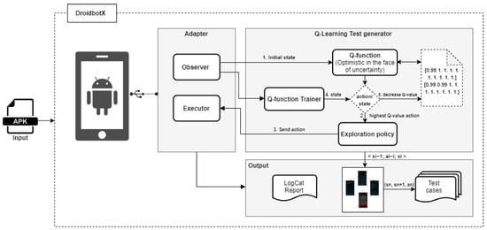 Q-Learning technique with UCB exploration strategy was adopted to generate a GUI test case for Android apps to improve coverage and crash detection. This approach was built in a test tool named DroidbotX. Moreover, the main idea of using DroidbotX was to evaluate the practical usefulness and applicability of the proposed approach. DroidbotX works with Droidbot [28]. Droidbot is a UI-guided input generation tool used mainly for malware detection and compatibility testing. Droidbot was chosen because it is open-source and can test apps without having access to the apps’ source code. Moreover, it can be used on an emulator or real device without instrumentation and is compatible with all Android APIs. The DroidbotX algorithm tries to visit all states because it assumes “optimism in the face of uncertainty”. The principle of optimism in the face of uncertainty is known as a heuristic in sequential decision-making problems, which is a common point in exploration methods. The agent believes that it can obtain more rewards by reaching the unexplored parts of the state’s space [61]. In this principle, actions are selected greedily, but strong optimistic prior beliefs are put on their payoffs so that strong contrary evidence is needed to eliminate the action from consideration. This technique has been used in several RL algorithms, including the interval exploration method [62]. In other words, it means that visiting new states and making new actions would bring the agent more reward than visiting old states and making old actions. Therefore, it starts from an empty Q-function matrix and assumes that every state and action reward an agent with . When it visits the state and makes an action a, the Q-function Q (s, a) decreases, and the priority of the action for the state becomes lower. Our DroidbotX approach generates sequences of test inputs for Android apps that do not have an existing GUI model. The overall DroidbotX architecture is shown in Figure 2.