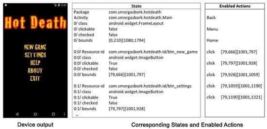 For simplifying states and actions representation, take an example of the Hot death app. Hot death is a variation of the classic card game. The main page includes a new game, settings, help, about, and exit buttons. Figure 3 shows a screenshot of the app’s main activity, initial state, and related widgets with a set of enabled actions. Widget-dependent action is detected when a related widget exists on the screen. For example, a click-action exists only if there is a related widget with the attribute clickable true. Widget-independent action is available in all states because the user can press on device hardware buttons such as the home all the time.