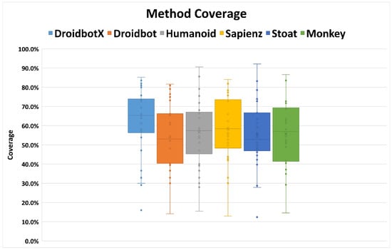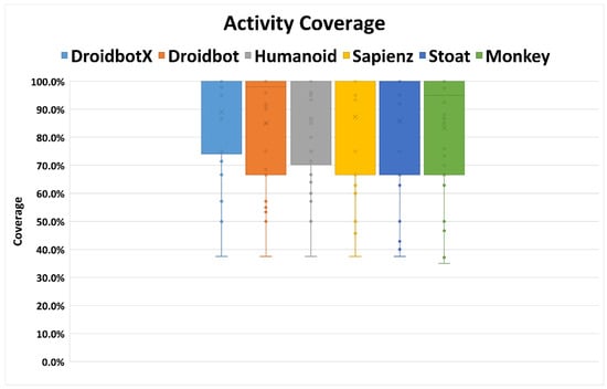 This approach was implemented into the test tool named DroidbotX (https://github.com/husam88/DroidbotX, accessed on 9 February 2021) and it is publicly available. The problem-based learning approach in teaching the public using DroidbotX is also available in the ALIEN (Active Learning in Engineering) (https://virtual-campus.eu/alien/problems/droidbotx-gui-testing-tool/, accessed on 9 February 2021) virtual platform. The tool was used to evaluate the practical usefulness and applicability of our approach. DroidbotX constructs a state-transition model of an app and generates test cases. These test cases follow the sequences of events that are the most likely to explore the app’s functionalities. The proposed approach was evaluated against state-of-the-art test generation tools. DroidbotX was compared with Android Monkey [27], Sapienz [16], Stoat [15], Droidbot [28], Humanoid [29] on 30 Android apps from the F-Droid repository [30].