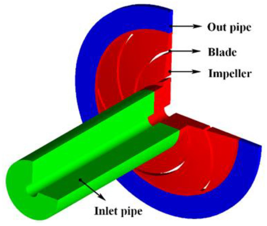 The geometric model of the centrifugal pump impeller is a single stage in the low specific speed multi-stage centrifugal pump commonly used in industry, as shown in Figure 1. The impeller has six vertical blades. The impeller parameters are as follows: the head H = 1.75 m, rotating speed n = 725 rev/min, and flow rate at design load Qd = 3.06 L/s. The outer radius of the impeller is 95 mm, and the inlet height and outlet height are 13.8 and 5.8 mm, respectively. Several other parameters of the centrifugal pump impeller are listed in Table 1.