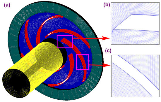Figure 3. Grids of centrifugal pump impeller: (a) view of centrifugal pump impeller, (b) blade front view, (c) blade middle view.
