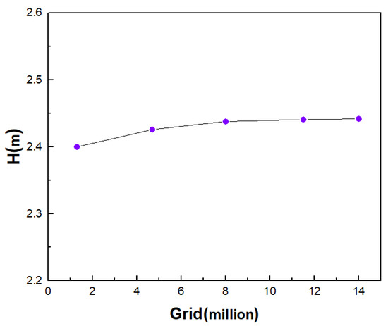 In this paper, the change of the external characteristics of the centrifugal pump with the number of grids at 0.25Qd was studied. As shown in Figure 4, with the increase of the number of grids, the head of the centrifugal pump impeller gradually increases. After 10 million grids, the head of the centrifugal pump impeller becomes stable. Compared with 14 million grids, the relative error of the head calculated with 12 million grids was less than 0.1%. Considering the efficiency of the calculation process and the minimum requirements of the LES computing grid, the 12 million grids number model was finally selected for follow-up research.