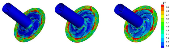 Figure 6. y+ distribution on the centrifugal pump impeller during a quasi-steady condition. 0.25Qd (left); 0.50Qd (middle); 0.75Qd (right).