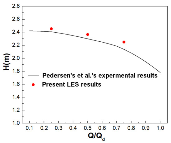The head obtained by the LES is in good agreement with the experimental data performed by Pedersen et al. [5]. Although the former averaged head is larger than that for the latter, the relative errors of the two methods are less than 5%, as shown in Figure 7. Compared with 0.25 Qd and 0.5 Qd conditions, the head of the impeller under a 0.75 Qd condition is quite different from the fitted head curve. There are two reasons for this phenomenon. First, Pedersen [5] only conducted experiments on this centrifugal pump impeller under 0.25 Qd and 1.0 Qd conditions. The head curve in Figure 7 is the result depicted by Pedersen [5], which is not absolutely accurate. Second, according to the previous numerical calculation results, this impeller has a hump near the 0.7 Qd condition, so the head of the impeller will be raised in the 0.75 Qd condition. The distributions of the relative velocity for both the two methods are similar, and present obviously “two-channel” (one of the two adjacent channels is in a stall state and the other is in a non-stall state) phenomenon under a quarter load, as shown in Figure 8left,right. The relationship between stall passage and non-stall passage is central symmetry about the impeller rotating shaft.