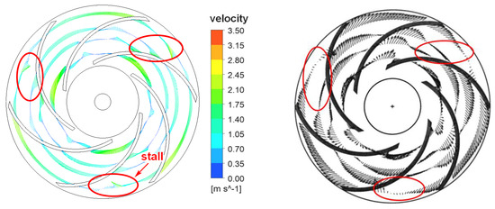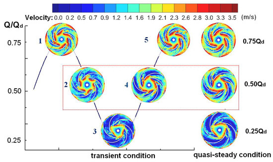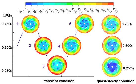 In order to investigate the influence of transient flow rate on the internal flow on the impeller mid-height plane (z/b2 = 0.5), the distributions of pressure and relative velocity during a quasi-steady condition, including three constant flow rates (0.75Qd, 0.5Qd, and 0.25Qd), are also shown in Figure 10 and Figure 11, respectively. Note that non-stall is observed on 0.75Qd, whereas the stall will appear at 0.5Qd and 0.25Qd. It is indicated that the stall characteristics are not varied by a periodic transient condition under the three flow rates. However, there are still several differences between the transient and quasi-steady conditions, especially at 0.5Qd. For example, due to the internal flow field being expanded during a transient condition at the dropping stage, the two-channel phenomenon is weaker than that for the quasi-steady condition. An opposite effect is at the rising stage. Therefore, the transient flow has a significant effect on the internal flow in the centrifugal pump impeller, even the stall.
