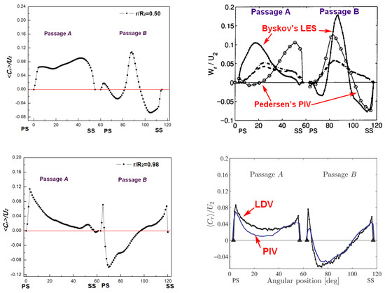 Figure 9. Blade-to-blade distributions of the mean radial velocity <Cr>/U2 measured with an experiment (right) [36] and LES simulation (left) at 0.25 Qd. r/R2 = 0.50 (up); r/R2 = 0.98 (down).