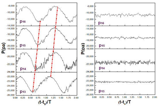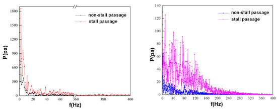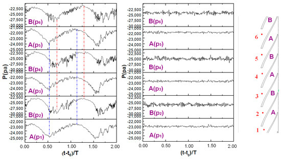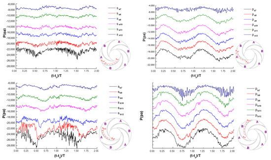 Figure 12left shows the pressure fluctuation in the impeller mid-height at the passage inlet during a transient condition. Note that the information of pressure fluctuation is abundant, including its low-frequency component. The evolution of low-frequency pressure fluctuation shows obvious periodicity, whose frequency is the same as that for the flow rate. Several differences are observed between the stall passage (B) and non-stall passage (A). Firstly, compared with Passage A, the phase of Passage B is one-tenth of a period behind. Secondly, the maximum and minimum values of pressure of Passage A are approximated as −21,000 Pa and −25,000 Pa, whereas the maximum and minimum values of pressure for Passage B are approximately −22,000 Pa and −29,000 Pa, respectively. It is indicated that the amplitude of the pressure fluctuation for Passage B is twice as large as Passage A.