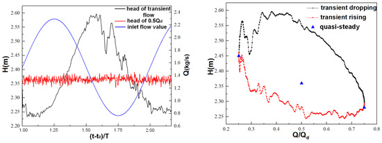 In addition, the difference of the pressure between the inlet and outlet planes of the computational domain can be respected by the head. Figure 17 shows the relationship between the head and time and flow rate. Note that the head for the transient condition cannot be represented by a value but varies within a range of 2.23 and 2.58 m, which is different from the quasi-steady condition. The frequency of the head has no relationship with that for the flow rate. However, compared with the flow rate, the phase of the head lags one-third of period. Moreover, the maximum and minimum values of the head are larger and smaller than that for quasi-steady conditions at three quarter-load and quarter-load, respectively. For the instantaneous two quarter-load, the head under transient rising and dropping stages are always larger and smaller than that for quasi-steady conditions.