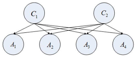 Here, it is illustrated that the key to solving the multilabel classification problem lies in the weighting of sample features. First, we constructed a WNBMLC (see Figure 3), where the nodes C1 and C2 correspond to the class attributes C1 and C2. The nodes A1, A2, A3, and A4 represent the four attributes, A1, A2, A3, and A4. The class nodes C1 and C2 are the parent nodes of the attribute nodes A1, A2, A3, and A4. The weights of the conditional attributes A1, A2, A3, and A4 for the selection of a class label from the class label set C = {C1, C2} are w1, w2, w3, and w4, respectively. In this work, a CA was used to iteratively optimize the selection of feature weights.