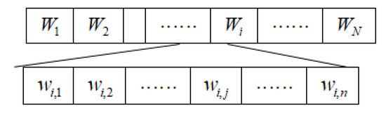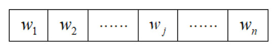 In the proposed algorithm, the individuals (chromosomes) in the POP space are designed using real-number coding. The variables of the individuals are randomly initialized in the (0.0, 1.0) range of real numbers so that each chromosome consists of a set of real numbers. The dimensionality of the chromosome is equal to the dimensionality of the conditional attributes in the sample data. Moreover, each real number corresponds to a conditional attribute in the dataset. Suppose that the population size is N and that the attribute dimensionality of an individual in the population is n. Then, each individual in the population, Wi, may be expressed as an n-dimensional vector such that Wi = {w1, w2, …, wj, … wn}. In this equation, wj is the weight of the j-th attribute of individual wi, which is within (0.0, 1.0). The structure of each chromosome is shown in Figure 4.