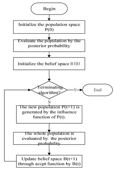 As naïve Bayes multilabel classification can be considered an optimization problem, many researchers have attempted to apply intelligent optimization algorithms to it [29,30,31,32,33,34,35]. The intelligent optimization algorithms have wide applications [36,37,38,39,40,41,42,43,44,45,46,47,48,49,50,51,52,53,54,55,56,57]. Cultural algorithms are a type of intelligent search algorithm; compared to the conventional genetic algorithm, cultural algorithms add a so-called “belief space” to the population component. This component stores the experience and knowledge learned by the individuals during the population’s evolution process. The evolution of the individuals in the population space is then guided by this knowledge. Cultural algorithms are established to be particularly well-suited to the optimization of multimodal problems [58,59]. Based on the characteristics of the samples in this work, a cultural algorithm was used to search for the optimal naïve Bayes multilabel classifier. It was then used to predict the class labels of test samples.