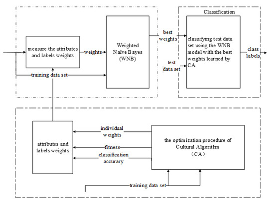 In the CA-WNB algorithm, the main purpose of the CA is to determine the weight of the attributes for label selection as the weight searching process is effectively a label-learning process. Once the optimal weights have been determined, the attribute weights may be used to classify the test set’s instances. The architecture of the CA-WNB algorithm is shown in Figure 9. The procedure of the CA-WNB algorithm is described below. It provides a detailed explanation of the algorithm’s architecture. The training of the CA-WNB algorithm is performed according to the following procedure: