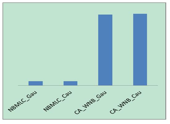 It is apparent that the average accuracy obtained by the CA-WNB algorithm is superior to that of the NBMLC algorithm. However, this is obtained at the expense of computation time. The CA-WNB algorithm iteratively optimizes attribute weights prior to the prediction of class labels so as to weaken the effects of the naïve conditional independence assumption. Even if one overlooks the effects of having multiple prediction methods and different training and test dataset sizes on the computation time, the time complexity of the CA-WNB algorithm is still NP × MAXGEN times higher than that of the NBMLC algorithm (NP is the population size, and MAXGEN is the maximum number of evolutions). The running times of the CA-WNB and NBMLC algorithms (under the same conditions and environment as in the abovementioned experiments) are shown in Figure 11. NBMLC-Gau and NBMLC-Cau are the running times of the NBMLC algorithm with Gaussian and Cauchy distribution, respectively. Meanwhile, CA-WNB-Gau and CA-WNB-Cau are the running times of the CA-WNB algorithm with Gaussian and Cauchy distribution, respectively.