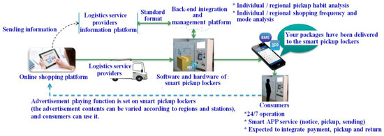 The self-service package pickup mode was adopted by the Packstation service of DHL in Germany, the InPost service of Integer.pl in Europe, and the POPStation service in Singapore. In Taiwan, the two major systems are iPickup by ITRI and Palmbox. Integrating automation and mobile technology for unmanned pickup can enhance users’ privacy and convenience and reduce the load of multiple-distribution logistics. With the advent of the sharing economy, undifferentiated pickup services have been provided for the public (regardless of logistics providers). The shopping frenzy on Singles’ Day (11/11) continues to increase year by year, and the day has become the largest online shopping event of the year, making logistics the battlefield in e-commerce. It was estimated that the logistics and home delivery market of Taiwan would reach the scale of USD 1 billion in 2019 [4,5,6,7,8].