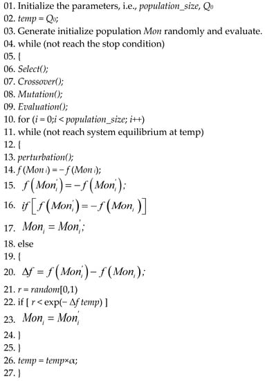 The simulated annealing–genetic algorithm, which is a hybrid of the genetic algorithm and the simulated annealing method, as shown in the Figure 2, is proposed in this paper [3,15,16]. It improves the ability of the genetic algorithm to search for regions by using the characteristics of the simulated annealing method, which can make small disturbances in adjacent regions of the solution [22,23].