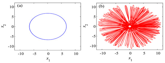 Now, we employ the function “FDE12.m” (https://www.mathworks.com/matlabcentral/fileexchange/32918-predictor-corrector-pece-method-for-fractional-differential-equations (accessed on 20 January 2021)) under Matlab software to implement the ABM algorithm. However, Figure 1 shows the phase diagrams of system (2) for different values of the derivative order q. As shown in this figure, a periodic circle and chaotic attractor are observed with derivative order q = 0.98 and 0.998, respectively.
