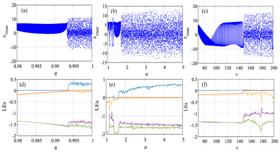 Dynamics of the system (2): (a–c) the bifurcation diagrams versus q, a, and c varying, respectively; (d–f) LEs versus q, a, c varying, respectively.