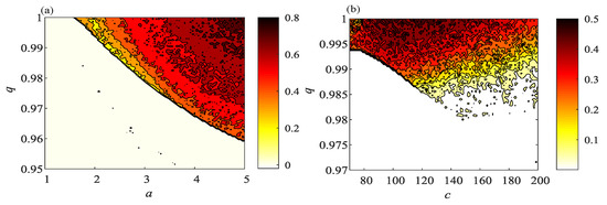 According to the bifurcation diagram results in the above three cases, the system is chaotic with a relatively large derivative order q, the parameters a and c. Vary q from to 1 with a step size of , and vary a from 1 to 5 with a step size of . The largest Lyapunov exponents contour plot of the system is illustrated in Figure 3a. Obviously, the system has relatively large Lyapunov exponents in the top right corner of the parameter plane. Meanwhile, the minimum order for chaos is about according to Figure 3a. Moreover, we vary the derivative order to 1 with a step size of , and increase c from 70 to 200 with a step size of 1.3. The largest Lyapunov exponents contour plot is depicted in Figure 3b. It is clear that the higher complexity values of the system appear with larger values of q and the smaller values of c.