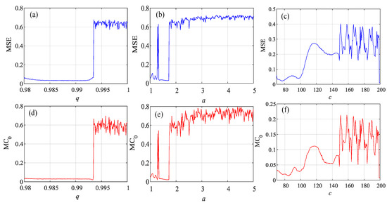 MSE and MC are employed to estimate the complexity of system (2), where the maximum scale factor . Complexity results with q varying are plotted in Figure 4a,d, and complexity results with a and c are plotted in Figure 4b–e and Figure 4c–f, respectively. Meanwhile, complexity results in the and parameter planes are shown in Figure 5. Firstly, it is obvious that the complexity results coincide with the bifurcation diagram and Lyapunov exponents. Secondly, it means that the system exhibits high complexity for real applications. Here, we vary a from 1 to 5 with a step size of 0.04, and increase c from 70 to 200 with a step size of 1.3. The complexity contour plots with q = 0.98, 0.99 and 0.999 are shown in Figure 6. It can be observed that the wider region of high complexity values appear when q takes larger values. Meanwhile, the system exhibits larger complexity values when parameter c is larger, and the system has wider range of high complexity when the parameter a is relatively larger. In conclusion, q, a, and c determines the complexity performance of the system.