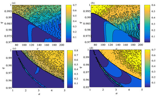 (1) Fix a = 2.0, b = 0.8, c = 70, d = 0.01, = 0.005, = 0.01 and vary q from to 1 with a step size of . Figure 2a,b depict the dynamics of system (2) using two significant analyses, which are the bifurcation diagram and Lyapunov exponents, respectively. Multi-periodic or periodic appears when q takes smaller values, but it becomes to be chaotic when . As a result, with the derivative order, system (2) owns bright dynamics.