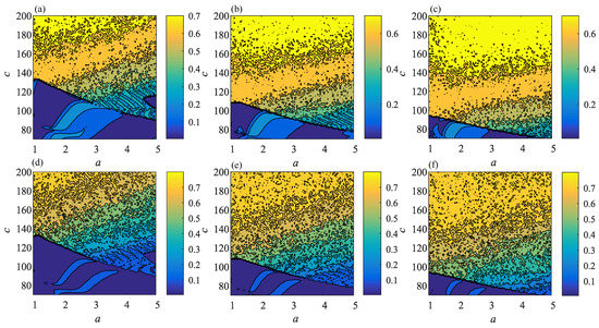(3) Fix a = 2.0, c = 100, d = 0.01, = 0.005, = 0.01, and vary c from 70 to 200 with a step size of 0.52. The dynamics of system (2) are depicted in Figure 2c,f. As shown in Figure 2c,f, the system becomes too chaotic when . However, starting from , the maximum Lyapunov exponent is close to zero.