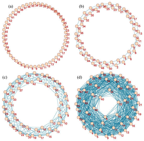 where is the coupled strength, is the number of the nearby nodes, contains the index of the nearby nodes, and there are N nodes () in the network. In this paper, each node contains a fractional-order laser system. As a matter of fact, the node i is connected with its nearby nodes. Figure 7 shows the networks of 50 nodes with different values of K. When , each node is connected with its two neighbors. The dynamics of this kind of network are investigated by He et al. [39] but with different systems. When , there are more connections, and the network becomes more and more complicated with the increase of K.