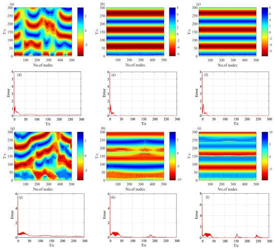 Spatiotemporal patterns and errors of the ring network of fractional-order laser systems with 500 nodes and the couple strength : (a–c) Spatiotemporal patterns with and K equal to 10, 50, 100, respectively; (d–f) errors with and K equal to 10, 50, 100, respectively; (g–i) spatiotemporal patterns with and K equal to 10, 50, 100, respectively; (j–l) errors with and K equal to 10, 50, 100, respectively.
