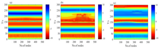 Spatiotemporal patterns of the ring network of fractional-order laser systems with 500 nodes, the couple strength , the derivative order and the connections number : (a) the first time; (b) the second time; (c) the third time.