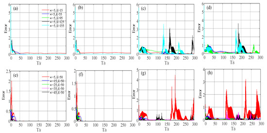 Errors of the ring network of fractional-order laser systems with 500 nodes: (a) , , different K and the experiment of the first time; (b) , , different K and the experiment of the second time; (c) , , different K and the experiment of the first time; (d) , , different K and the experiment of the second time; (e) , , different and the experiment of the first time; (f) , , different and the experiment of the second time; (g) , , different and the experiment of the first time; (h) , , different and the experiment of the second time.