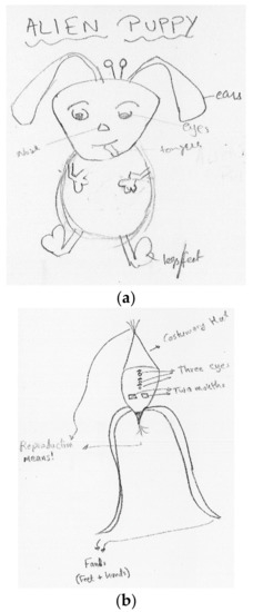 Each invariant was rated using assigned values, indicated here in parentheses. The categories for bilateral symmetry included undoubted bilateral symmetry (0), bilateral symmetry if the creature were rotated (0), superficial violation of bilateral symmetry (e.g., an additional limb or appendage on one side; 1), undoubted absence of bilateral symmetry (2), and those responses which were unclear in regard to this invariant (0). The standard presence of two eyes and four limbs were assigned values based on the following criteria: does not deviate from the invariant (possesses two eyes and/or four limbs; 0), depicting a greater number of features than the invariant (exceeding two eyes or four limbs; 2), drawing fewer features than the invariant (for example, drawing only one eye or three limbs; 2), drawing no such features whatsoever (1), and once again, those responses which are unclear in this regard (0). Altogether, every drawing obtained an invariant score ranging from 0 (not violated) to 2 (clearly violated). Subsequently, the total invariants violation (IV) score was computed as a total of three invariants scores. The IV score ranged from 0 to 6; a higher score suggested a greater tendency to violate the standard invariants in the drawing. Figure 1 presents two cases illustrating (a) no violation of invariants and (b) some violation of invariants. An ‘alien puppy’ (Figure 1a) is bilaterally symmetric (score 0), has two eyes (score 0) and four limbs (score 0); its IV = 0. The creature in Figure 1b is bilaterally symmetric (score 0), has more than two eyes (score 2) and two limbs (score 2); its IV = 4.
