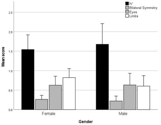 Distribution of invariant violation (IV) and its component across gender (female: n = 59; male: n = 34).