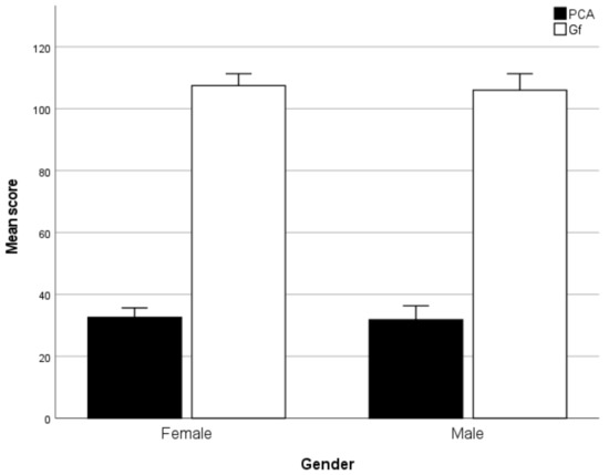 Distribution of preference for complexity and asymmetry (PCA) and fluid intelligence (Gf) as the predictors of invariant violation across gender (female: n = 59; male: n = 34).