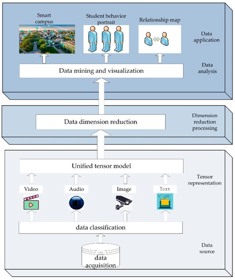 In this chapter, icHOSVD dimension reduction algorithm for unstructured campus big data will be introduced in detail. The overall process framework is shown in Figure 2. The overall framework is divided into three layers, each layer has its own task. After obtaining various kinds of data from data sources, the lowest level presents the data tensor to form a unified tensor model, and then the second level reduces the dimension of the data model, and then the results can be used for data analysis and application.
