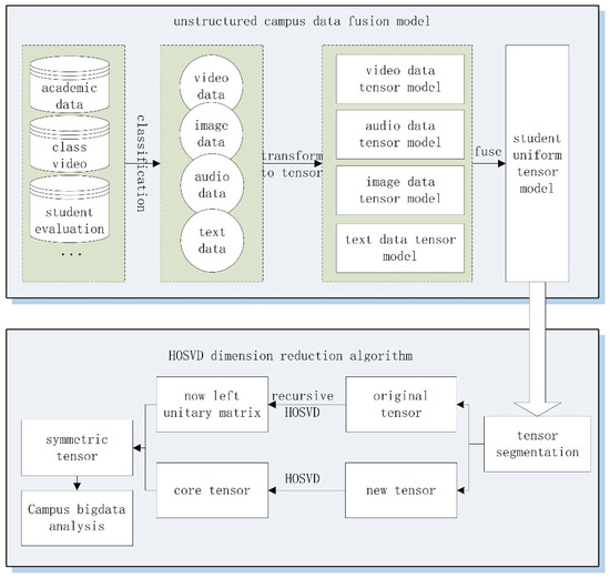 Therefore, in view of massive unstructured campus big data, this paper proposes an incremental High-Order Singular Value Decomposition (icHOSVD) dimensionality reduction algorithm for unstructured campus big data. In our algorithm, firstly, the video, audio and image of unstructured campus data are represented as a unified sub tensor model by tensor, and a campus big data fusion model based on a semi tensor product is proposed. Secondly, in the process of dimensionality reduction of the unified representation data model, the traditional data dimensionality reduction method was improved, and the big data icHOSVD dimensionality reduction method based on tensor block was proposed. The new data were used to quickly update the core dataset that had been calculated, so as to improve the efficiency of the big data dimensionality reduction algorithm.