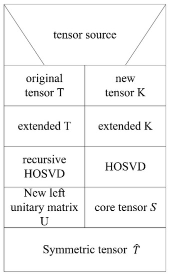 After extending the original tensor and the new tensor to the same dimension, we can get the mode unfolded matrix of tensor by unfolding the tensor . The mode unfolded matrix of tensor can be updated by calling the recursive HOSVD algorithm. For the original tensor, HOSVD is used to obtain the core tensor and the left unitary matrix . Finally, a new symmetric tensor is obtained by combining the model unfolded matrix, which is updated by the recursive matrix HOSVD algorithm and the core tensor of the original tensor . The flow chart is shown in Figure 5.