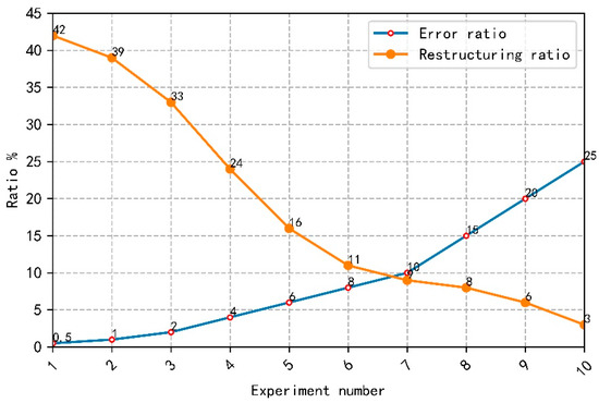 In this paper, we use to reflect the relationship between a dimensionality reduction ratio and a reconstruction error rate. The relationship between a dimensionality reduction ratio and a reconstruction error rate is shown in Figure 6. The abscissa is the number of experiments and the ordinate is the ratio value. We selected the same unstructured image data and set the error rate as 0.5%, 1%, 2%, 4%, 6%, 8%, 10%, 15%, 20% and 25% successively. The larger the error rate, the greater the difference between the symmetric tensor and the original tensor, and the larger the error means that the similarity between the approximate tensor and the original tensor is low.