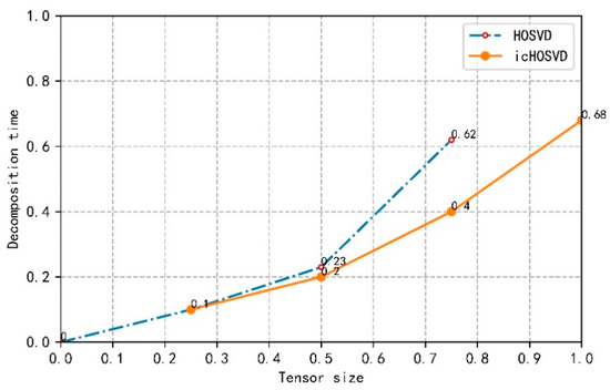 In order to evaluate the icHOSVD dimensionality reduction method, we use unstructured video data to construct a tensor model for experiments, and standardize the tensor decomposition time and tensor size to facilitate a comparison. The tensor model is divided into four parts. Under the same hardware conditions, the size and time of each method are calculated respectively. Comparing the efficiency of the decomposition algorithm of icHOSVD and traditional HOSVD, our experimental results are shown in Figure 7.