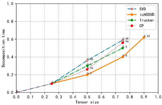 In Figure 8, we select several other common dimensionality reduction decomposition algorithms, namely SVD, trucker, CP decomposition algorithm, and use the same tensor model for experiments. Under the same conditions, we compare the time taken by each method to process the tensor size. As can be seen from Figure 8, the decomposition time of icHOSVD is relatively stable from the tensor size 0.25, but the decomposition time of traditional decomposition method and other decomposition methods increase rapidly. Under the same conditions, icHOSVD can decompose a larger tensor, whereas traditional SVD and Trucker and CP decomposition methods can only decompose half of the size of a tensor. Currently, the popular HOSVD decomposition method can only reach the tensor size 0.75, and then run out of memory. Through the above experimental analysis, the icHOSVD decomposition method based on tensor segmentation is more efficient.