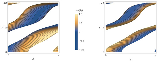 Taking into account that Equation (13) gives the values of s, and hence the energy levels, in terms of the triplet of parameters , then, according to (22), s will depend on the angular variables only. In general, we cannot solve (13) to find explicitly. Since (13) depends on four parameters , we cannot represent this equation in general but, as in Figure 1, we can plot the square root of the energy (essentially s) for given values of and as a function of .
