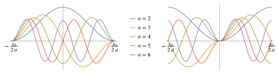 Hence, when the parity is preserved, Equation (13) holds. This happens for three different situations given by Equations (20a)–(20c). These formulas, plus (13), which derives from such a general principle as , should give the energy levels for the infinite square well with parity preserving self-adjoint extensions, , of .