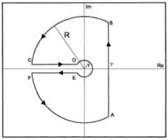 Before infinite integrals in (6) will be evaluated, it is of interest to derive the function by performing the complex integration from (1). In investigated case, the branch point of the integrand exists and is located at the origin and therefore the equivalent Bromwich contour is plotted in Figure 1. The closed contour of integration ABCDEFA includes the line AB, the arcs BC and FA of a circle of radius with center at origin, the arc DE of a circle of radius with center at origin, and two parallel lines CD and EF. The the cut along the negative axis ensures that is a single-valued function. However, according to the Cauchy lemma the integrals along the arcs BC and FA vanish as .